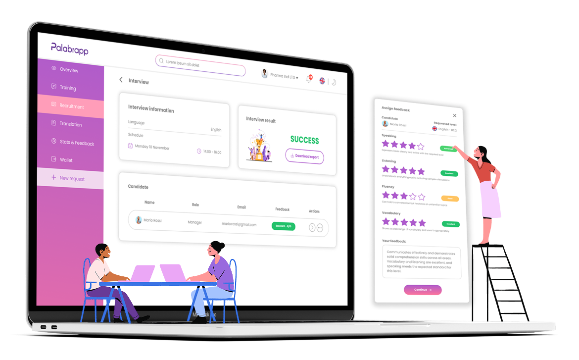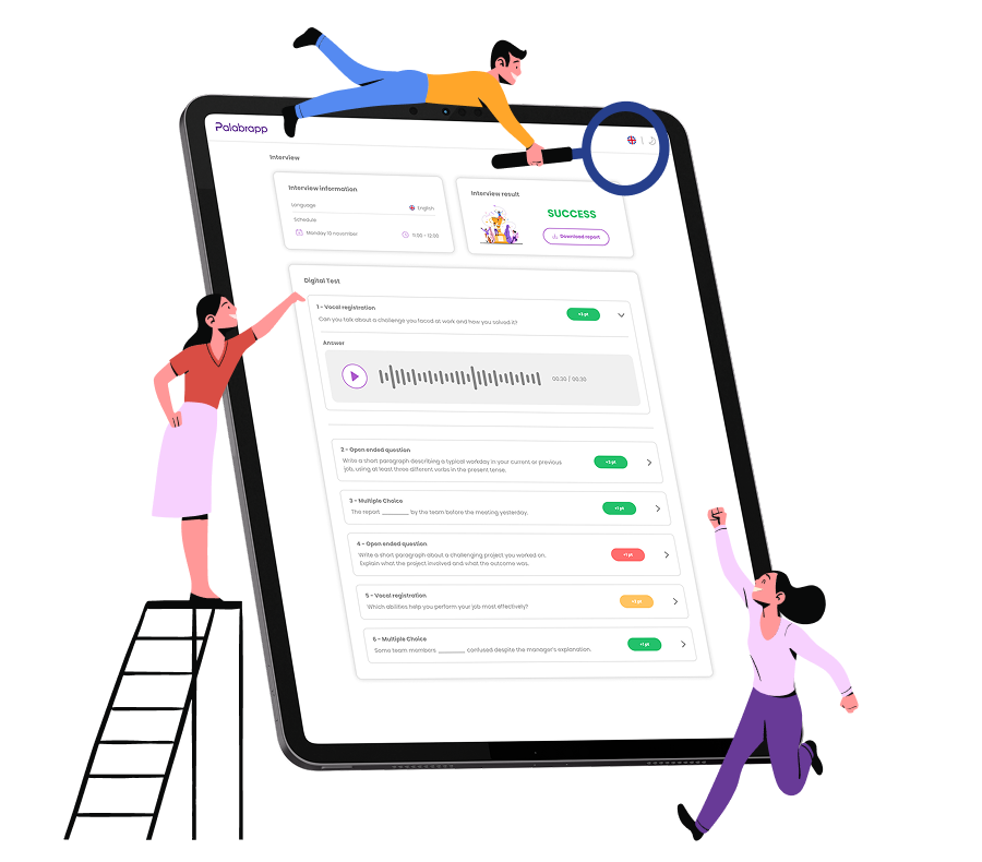 We help Recruiters & HR Departments evaluate the real language skills of their candidates during the recruitment process. Our AI-powered assessment system enhances accuracy, speeds up screening, and provides detailed reports to support smarter hiring decisions. Palabrapp combines digital testing tools with live assessments conducted by our professional language consultants to get accurate, reliable insights before hiring.