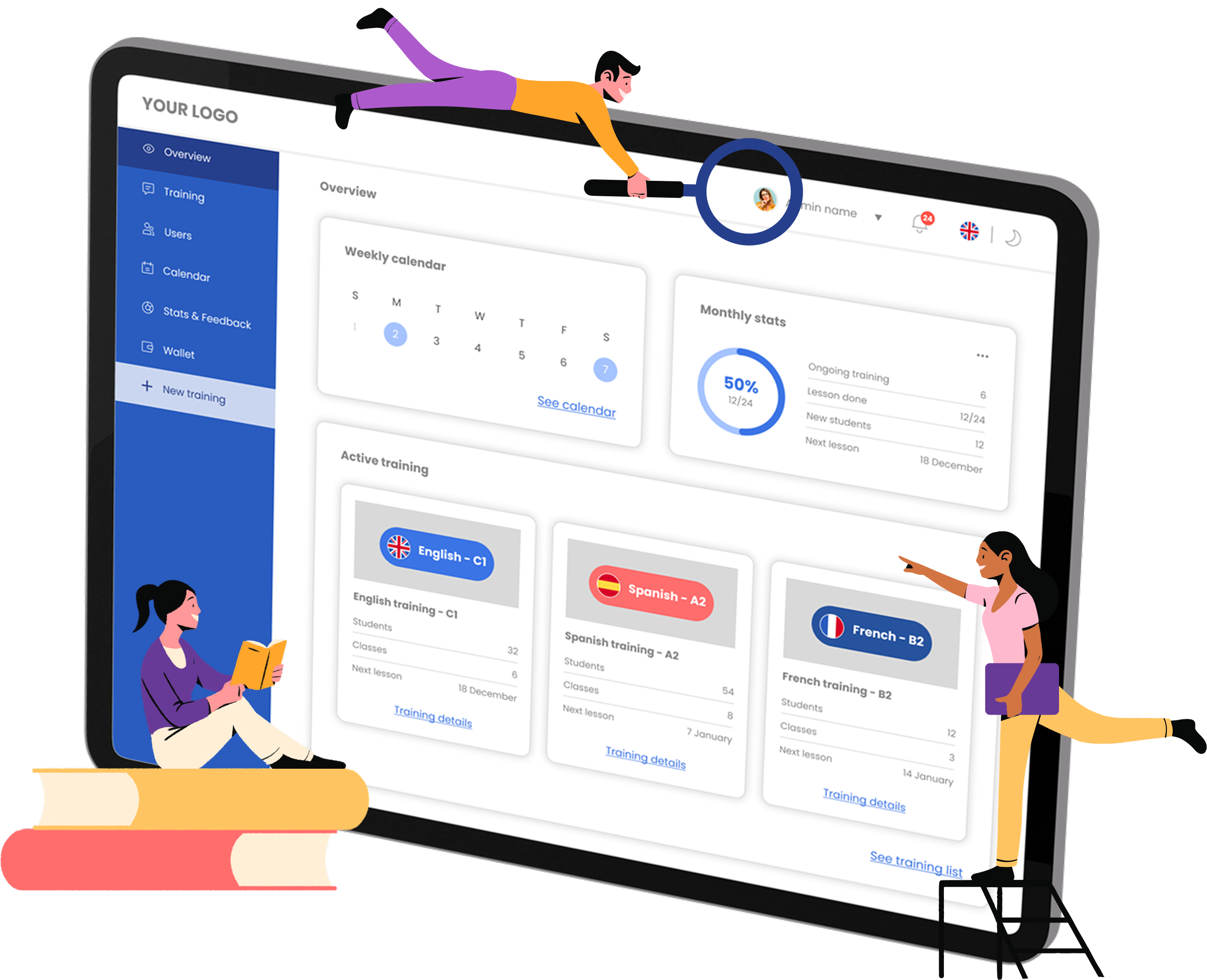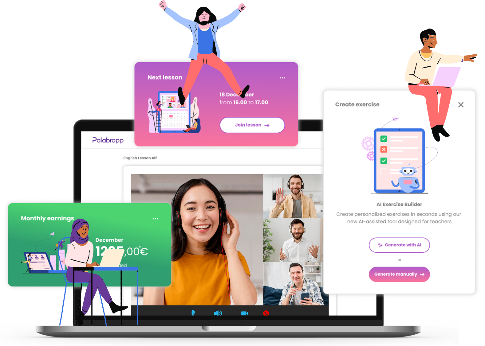 Palabrapp, the all-in-one platform designed to help language Trainers and Schools digitalise and manage their entire teaching activity. Schedule lessons, coordinate your team, assess students, and deliver high-quality multilingual services. Everything you need to run your school smoothly, all in one place.